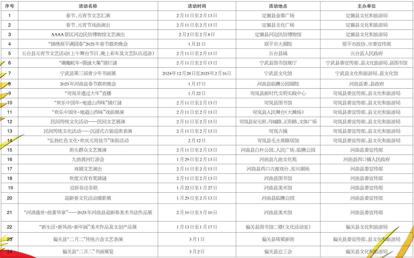 為給廣大市民、游客提供豐富多彩的“文旅大餐”,我市宣傳文化部門精心策劃推出文化文藝惠民活動(dòng),涵蓋春節(jié)民俗、文藝演出、非遺體驗(yàn)、戲曲展演、夜景燈展、巡游街演、書畫展出等多種形式,為廣大群眾奉上家門口的文化盛宴,營(yíng)造歡樂祥和、喜慶熱烈、文明向上的濃厚節(jié)日氛圍,滿滿“新年味”,濃濃“煙火氣”,給足過年“儀式感”。