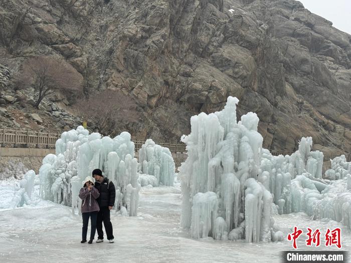 游客在賀蘭山巖畫景區(qū)內(nèi)的冰瀑布景觀群打卡拍照。 中新網(wǎng)記者 李佩珊 攝