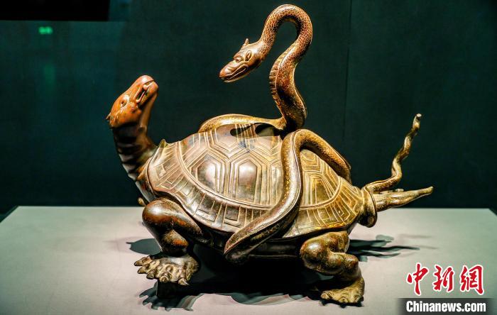 據(jù)介紹,玄武是中國古代傳說中鎮(zhèn)守北方的神獸,往往以龜蛇合體的形象出現(xiàn)。漢代以來,龜蛇作為玄武神的象征受到人們奉祀,后被道教吸收后將其人格化,逐漸成為道教的大神。