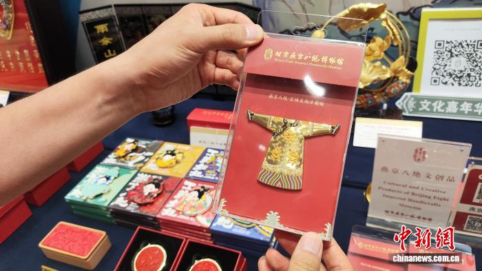 北京燕京八絕博物館依照館藏文物“京繡龍袍”設(shè)計(jì)的冰箱貼。(《中國新聞》報(bào) 任德輝 攝)
