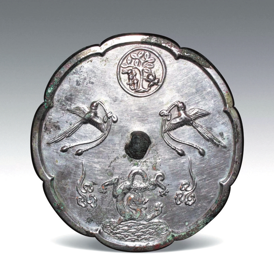 唐代張匯的《千秋鏡賦》云,千秋鏡背“或鑄或镕,是磨是削。刻以為龍,鏤以成鵲”,《文苑英華》亦載“鵲飛如向月,龍盤以映池”,與盤龍雙鵲月宮鏡上的紋飾恰好相符。盤龍、雙鵲、祥云,月宮中的玉兔、蟾蜍、桂樹(shù),成為此類銅鏡的畫(huà)面主體,引發(fā)人們對(duì)月宮的美好想象。