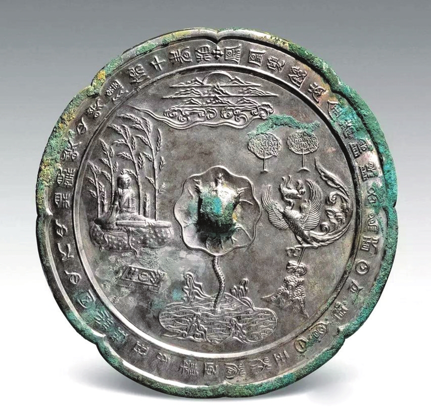 真子飛霜鏡一般都是圓形、葵花形,而西安出土的一面鏡形十分罕見(jiàn),為亞字形。鏡背上方云海托月,半個(gè)月亮浮上來(lái)。真子飛霜鏡的形制,多在細(xì)節(jié)上略有差異。除了鏡鈕上方有“真子飛霜”四字,或者有一只飛翔的仙鶴之外,還有一種在鏡緣飾篆書(shū)體銘文,鏡銘為:“鳳凰雙鏡南金裝。陰陽(yáng)各為配,日月恒相會(huì)。白玉芙蓉匣,翠羽瓊瑤帶。同心人,心相親,照心照膽保千春。”