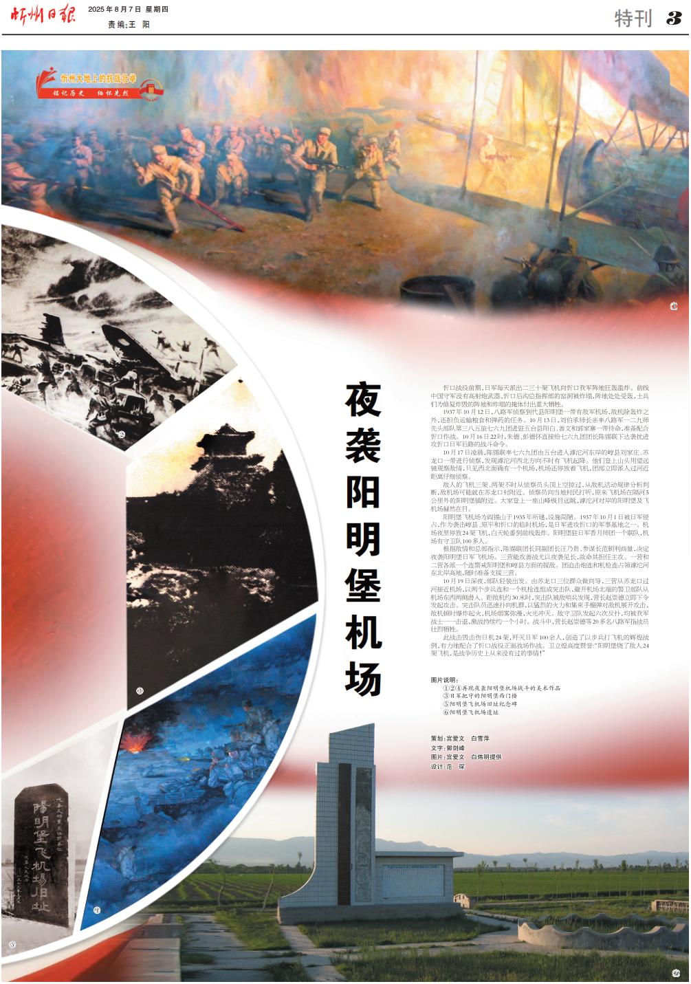 忻口戰(zhàn)役前期,日軍每天派出二三十架飛機向忻口我軍陣地狂轟濫炸。前線中國守軍沒有高射炮武器,忻口后溝總指揮部的窯洞被炸塌,陣地處處受轟,士兵們?yōu)樾迯?fù)炸毀的陣地和炸塌的掩體付出重大犧牲。 1937年10月12日,八路軍偵察到代縣陽明堡一帶有敵軍機場,敵機除轟炸之外,還擔(dān)負運輸糧食和彈藥的任務(wù)。10月13日,劉伯承師長親率八路軍一二九師先頭部隊第三八五旅七六九團進駐五臺縣陽白、善文和郭家寨一帶待命,準(zhǔn)備配合忻口作戰(zhàn)。10月16日22時,朱德、彭德懷直接給七六九團團長陳錫聯(lián)下達襲擾進攻忻口日軍后路的戰(zhàn)斗命令。 10月17日凌晨,陳錫聯(lián)率七六九團由五臺進入滹沱河?xùn)|岸的崞縣劉家莊、蘇龍口一帶進行偵察,發(fā)現(xiàn)滹沱河西北方向不時有飛機起降。他們登上山頭用望遠鏡觀察敵情,只見西北面確有一個機場,機場還停放著飛機,團部立即派人過河近距離仔細偵察。 敵人的飛機三架、兩架不時從偵察員頭頂上空掠過,從敵機活動規(guī)律分析判斷,敵機場可能就在蘇龍口村附近。偵察員向當(dāng)?shù)卮迕翊蚵?,原來飛機場在隔河5公里外的陽明堡鎮(zhèn)附近。大家登上一座山峰極目遠眺,滹沱河對岸的陽明堡及飛機場赫然在目。 陽明堡飛機場為閻錫山于1935年所建,設(shè)施簡陋。1937年10月1日被日軍侵占,作為襲擊崞縣、原平和忻口的臨時機場,是日軍進攻忻口的軍事基地之一。機場夜里停放24架飛機,白天輪番到前線轟炸。陽明堡駐日軍香月師團一個聯(lián)隊,機場有守衛(wèi)隊100多人。 根據(jù)敵情和總部指示,陳錫聯(lián)團長同副團長汪乃貴、參謀長范朝利商量,決定夜襲陽明堡日軍飛機場。三營能攻善戰(zhàn)尤以夜襲見長,故命其擔(dān)任主攻。一營和二營各派一個連警戒陽明堡和崞縣方面的援?dāng)场F迫擊炮連和機槍連占領(lǐng)滹沱河?xùn)|北岸高地,隨時準(zhǔn)備支援三營。 10月19日深夜,部隊輕裝出發(fā)。由蘇龍口三位群眾做向?qū)?,三營從蘇龍口過河接近機場,以兩個步兵連和一個機槍連組成突擊隊,避開機場北端的警衛(wèi)部隊從機場東西兩側(cè)潛入。距敵機約30米時,突擊隊被敵哨兵發(fā)現(xiàn),營長趙崇德立即下令發(fā)起攻擊。突擊隊員迅速撲向機群,以猛烈的火力和集束手榴彈對敵機展開攻擊,敵機頓時爆炸起火,機場煙霧彌漫,火光沖天。敵守衛(wèi)隊發(fā)起六次反撲,均被我軍戰(zhàn)士一一擊退,激戰(zhàn)持續(xù)約一個小時。戰(zhàn)斗中,營長趙崇德等20多名八路軍指戰(zhàn)員壯烈犧牲。 此戰(zhàn)擊毀擊傷日機24架,殲滅日軍100余人,創(chuàng)造了以步兵打飛機的輝煌戰(zhàn)例,有力地配合了忻口戰(zhàn)役正面戰(zhàn)場作戰(zhàn)。衛(wèi)立煌高度贊譽:“陽明堡燒了敵人24架飛機,是戰(zhàn)爭歷史上從來沒有過的事情!” 策劃: : 宮愛文 白雪萍 文字: : 郭劍峰 圖片: : 宮愛文 白煒明提供 設(shè)計: : 范 琛 (責(zé)任編輯:盧相?。?/span> |