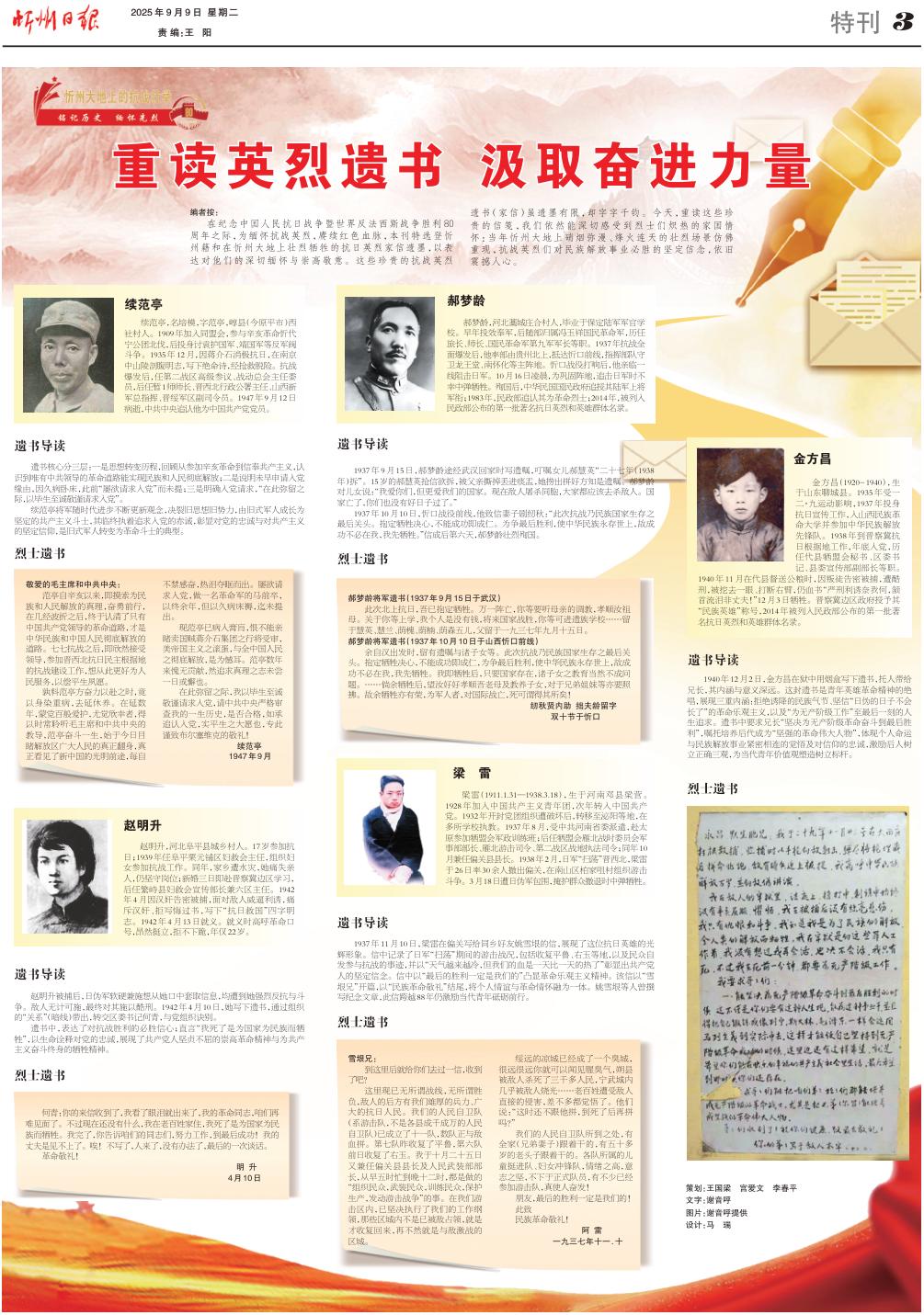 在紀(jì)念中國人民抗日戰(zhàn)爭暨世界反法西斯戰(zhàn)爭勝利80周年之際,為緬懷抗戰(zhàn)英烈,賡續(xù)紅色血脈,本刊特選登忻州籍和在忻州大地上壯烈犧牲的抗日英烈家信遺墨,以表達(dá)對他們的深切緬懷與崇高敬意。這些珍貴的抗戰(zhàn)英烈遺書(家信)雖遺墨有限,卻字字千鈞。今天,重讀這些珍貴的信箋,我們依然能深切感受到烈士們熾熱的家國情懷:當(dāng)年忻州大地上硝煙彌漫、烽火連天的壯烈場景仿佛重現(xiàn),抗戰(zhàn)英烈們對民族解放事業(yè)必勝的堅定信念,依舊震撼人心。