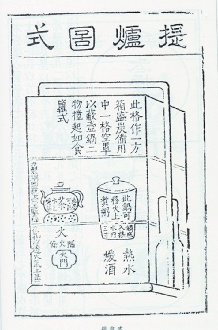 明代戲曲家高濂編撰的《遵生八箋》,可謂士大夫精致生活的指導(dǎo)書,書中仔細(xì)介紹了提爐的形制與結(jié)構(gòu),還附上了插圖。書云:“式如提盒,亦余制也。高一尺八寸,闊一尺,長(zhǎng)一尺二寸,作三撞。下層一格,如方匣,內(nèi)用銅造水火爐,身如匣方,坐嵌匣內(nèi)。中分二孔,左孔炷火,置茶壺以供茶;右孔注湯,置一桶子小鑊有蓋,頓湯中煮酒。長(zhǎng)日午余,此鑊可煮粥供客。傍鑿一小孔,出灰進(jìn)風(fēng)。其壺鑊迥出爐格上,太露不雅,外作如下格方匣一格,但不用底以罩之,便壺鑊不外見也。一虛一實(shí)共二格,上加一格,置底蓋以裝炭,總?cè)癯梢患埽峡晒涥P(guān),與提盒作一副也?!?/p>