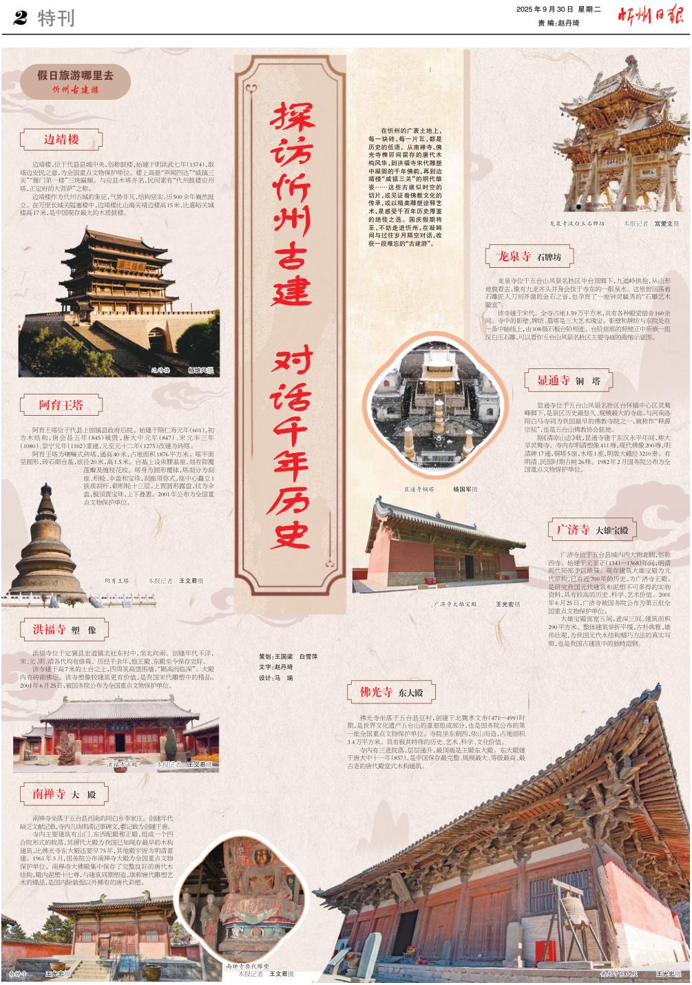 在忻州的廣袤土地上,每一塊磚、每一片瓦,都是歷史的低語(yǔ)。從南禪寺、佛光寺榫卯間留存的唐代木構(gòu)風(fēng)華,到洪福寺宋代雕塑中凝固的千年佛韻,再到邊靖樓“威鎮(zhèn)三關(guān)”的明代雄姿……這些古建似時(shí)空的切片,或見證著佛教文化的傳承,或以精美雕塑詮釋藝術(shù),是感受千百年歷史厚重的絕佳之選。國(guó)慶假期將至,不妨走進(jìn)忻州,在凝眸間與過(guò)往歲月隔空對(duì)話,收獲一段難忘的“古建游”。