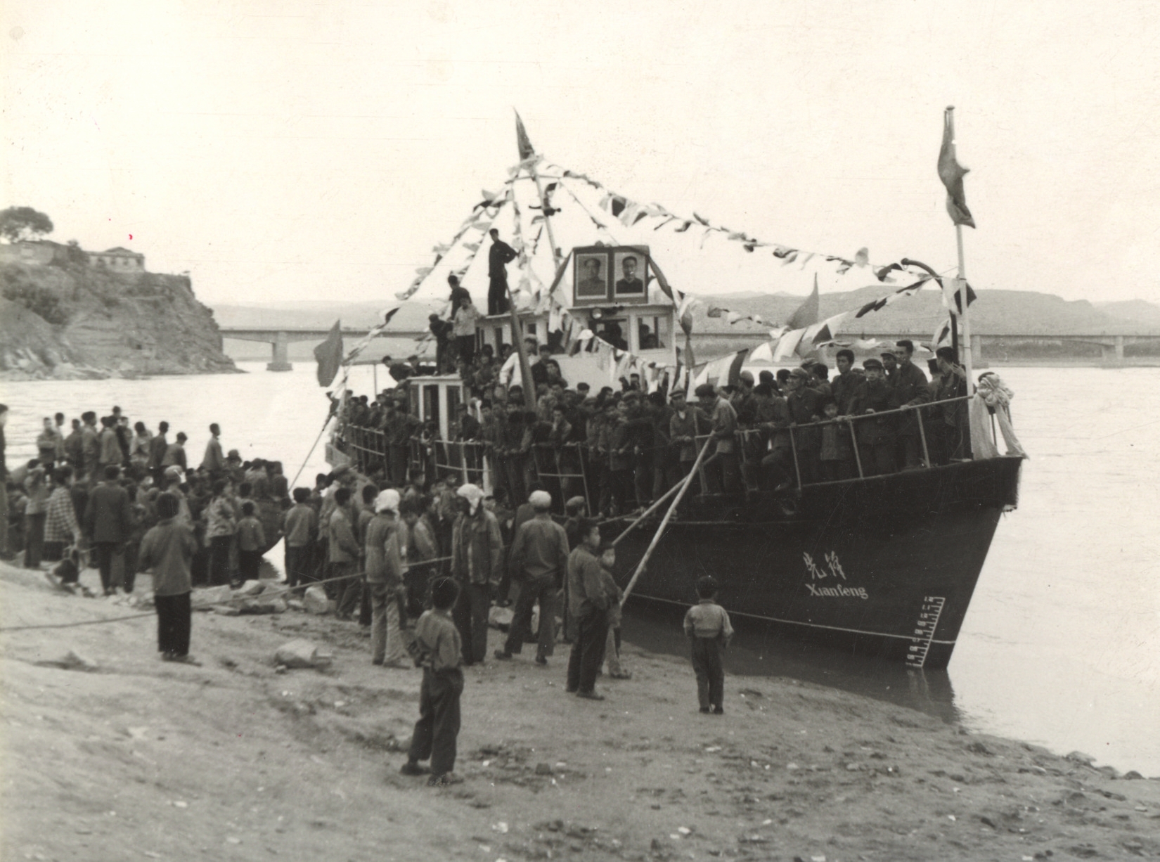 群眾在黃河邊圍觀保德縣設(shè)計(jì)制造出的第一艘“先鋒號(hào)”船