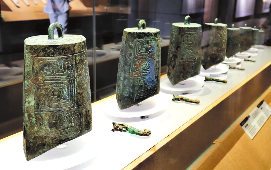 最具代表性的樂鐘無疑是“青銅之冠”的曾侯乙編鐘,它展現(xiàn)了先秦禮樂文明與青銅鑄造技術(shù)的最高成就。曾侯乙編鐘是戰(zhàn)國早期曾國國君的“禮樂重器”,1978年出土于今湖北隨州的曾侯乙墓,是迄今發(fā)現(xiàn)數(shù)量最多、保存最好、音律最全、氣勢最宏偉的一套編鐘,共65件,分3層8組懸掛于彩漆鐘架之上,鐘體總重達2.5噸。整套編鐘低音渾厚、中音圓潤、高音清脆,音域?qū)拸V,而且中心音域內(nèi)半音齊備,可以旋宮轉(zhuǎn)調(diào),演奏各種音樂。1978年8月1日,沉寂了2400多年的曾侯乙編鐘演奏了《東方紅》《國際歌》和古曲《楚殤》、民族歌曲《草原上升起不落的太陽》等各種樂曲,樂音悠揚回蕩。