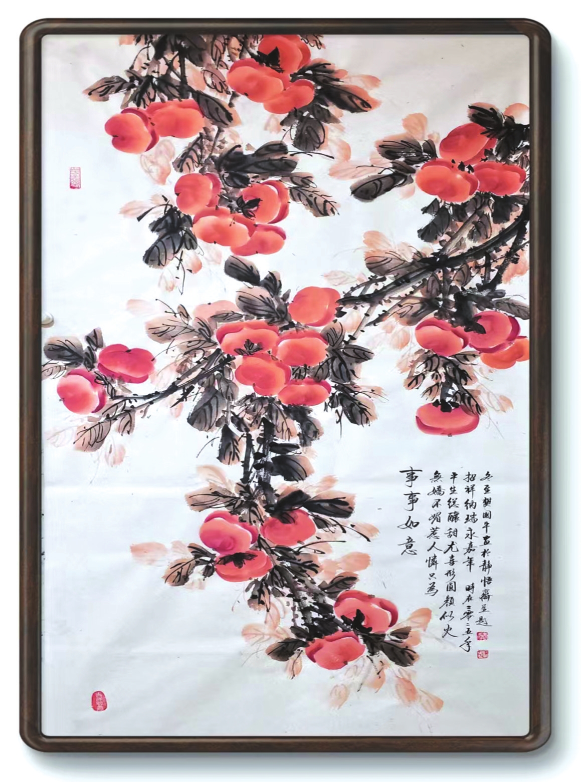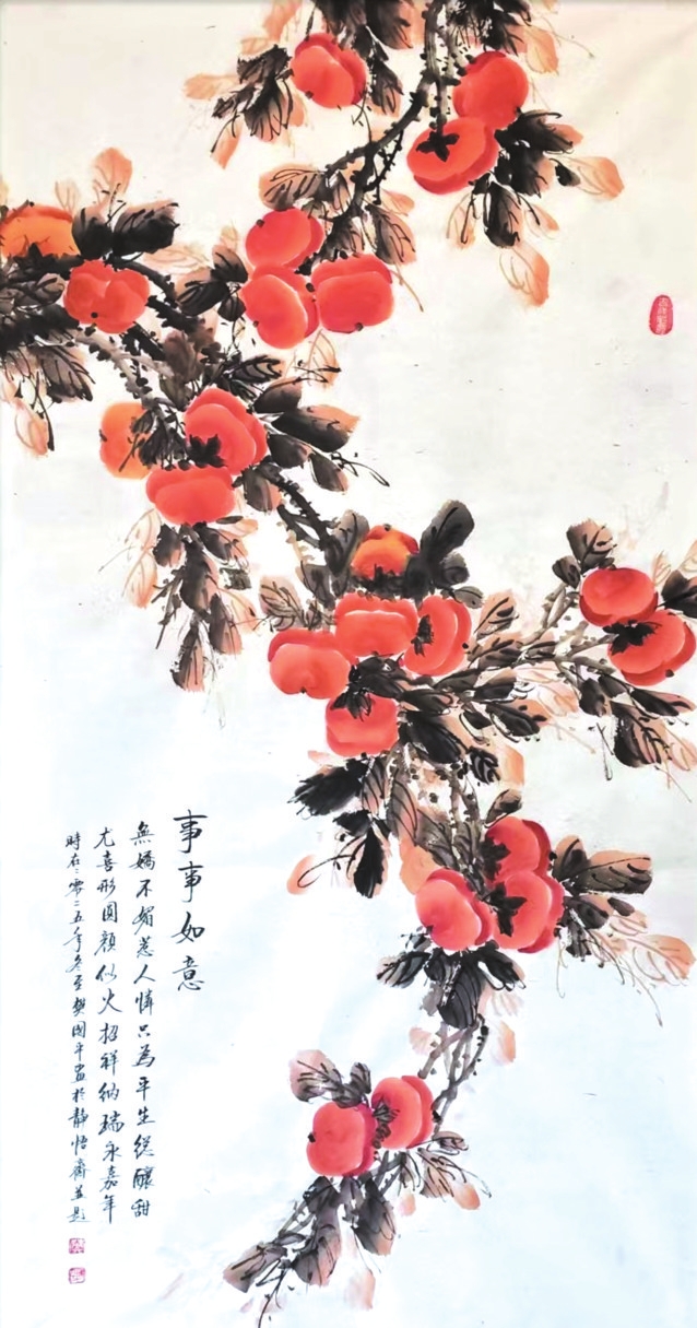 在樊國平眾多題材探索中,《事事如意》系列柿子圖可謂其藝術精神與人生哲思的縮影。這些作品超越了尋常花鳥畫的怡情悅性,成為她寄托情懷、叩問生命的重要載體。畫中那一串串、一簇簇丹柿,色澤溫潤,形態(tài)豐盈,承載著諧音“事事如意”的吉祥寓意,滿足了社會對美滿生活的樸素祈愿。她以此通俗意象為入口,引領觀者步入一個融匯儒、道、佛哲學理念的深邃境界,實踐著中國藝術“技進乎道”“以畫載道”的至高追求。