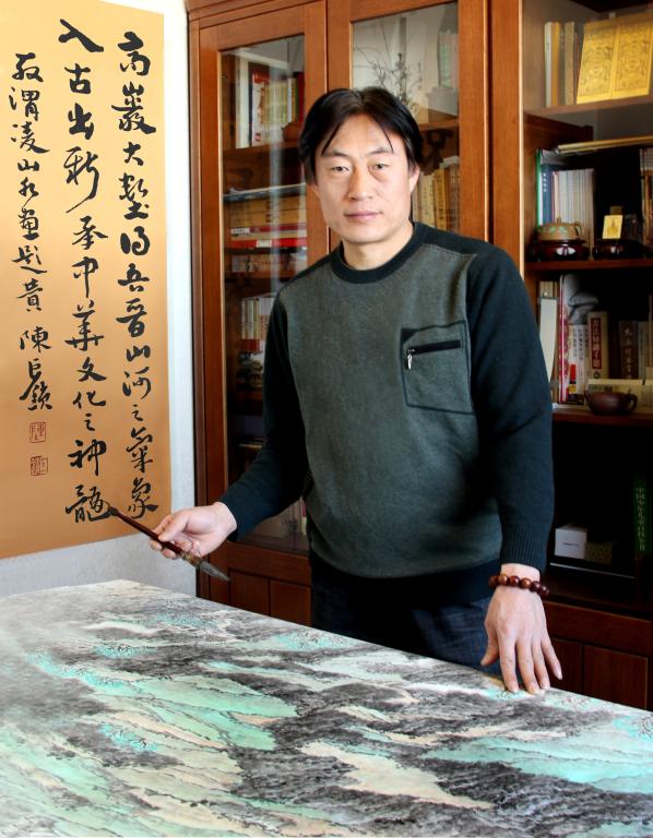 認識殷渭凌,是先認識他的畫,前幾年在一次省里畫展上看到了一幅山水畫,淳樸、厚重,樸實的親切、厚重的實在,完全沒有近幾年流行的風氣,也沒有長期臨摹傳統(tǒng)繪畫形成的習氣。正如一個從鄉(xiāng)村走出來的小伙,健康、有朝氣、單純、樸實、憨厚、怯生生的站在那里,給我留下了很深的印象。因為忻州地區(qū)畫山水的人不多,很快就認識了渭凌。果然人如其畫,淳樸、厚道、話不多、為人真誠,是個畫畫肯下功夫的小伙子。后來省美協(xié)山水畫藝委會的活動都有他的身影,畫越畫越多,畫的也越來越好,但是畫面中那種親切、樸實、厚重、蒼茫的特點卻一點兒也沒有丟失。濃濃的泥土氣息生發(fā)于筆墨中,散發(fā)在畫面里,在展廳里感染著每一個觀眾。晉西北風情在他的營造下得到了充分的體現(xiàn)。