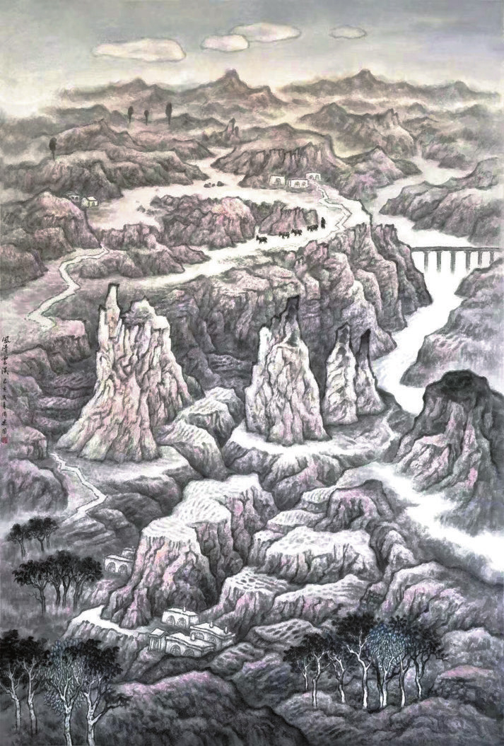 周建國對(duì)中國山水畫有著獨(dú)特見解,出版過畫集《中國美術(shù)名家精品鑒賞·周建國作品集》。他的創(chuàng)作之路主要分為兩個(gè)時(shí)期,前期追求中西融合,后期則回歸傳統(tǒng)。前期作品《曉月》《古原除夕》《月色》等,多取材于黃土高原,真切流露出其對(duì)黃土地的深情厚愛:早上飄起的炊煙演繹著百姓的勤勞,喧鬧的腰鼓彰顯著鄉(xiāng)民熱愛生活的豪情,晨起上課的學(xué)生更是承載著當(dāng)?shù)厝藵M滿的希望。周建國將黃土地上的一草一木皆升華為獨(dú)特且富有個(gè)性的生命體,畫面處理側(cè)重將西方油畫的光影巧妙融入作品,寓動(dòng)于靜,動(dòng)靜相宜,彰顯“高貴的單純,靜穆的偉大”的內(nèi)在張力。同時(shí)將傳統(tǒng)山水繪畫的造型、空間結(jié)構(gòu)、筆法設(shè)色皆進(jìn)行改變——黃土溝壑的幾何化處理、筆墨色調(diào)的反復(fù)拿捏、耐人尋味的空間布局,都體現(xiàn)了其特殊的創(chuàng)作理念。相較前期,周建國后期的作品更加注重對(duì)內(nèi)在美的挖掘,如《風(fēng)月同天》《家園》《和諧家園》《生息之地》《太行月色》等代表作品,表達(dá)對(duì)祖國山河大川的熱愛,走“外師造化,中得心源”之道,畫風(fēng)趨向率真,試圖突破中國山水繪畫的表象審美,追尋深層意義的表達(dá)。