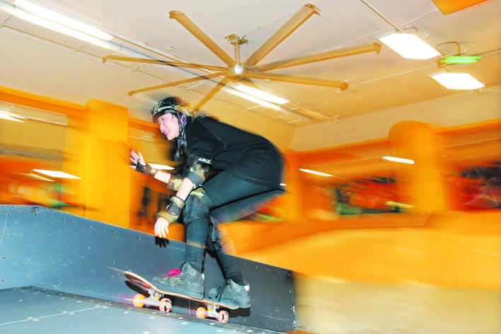 林子祎在北京的一家滑板俱樂部內(nèi)練習(xí)滑板(8月4日攝)。新華社記者 李明 攝