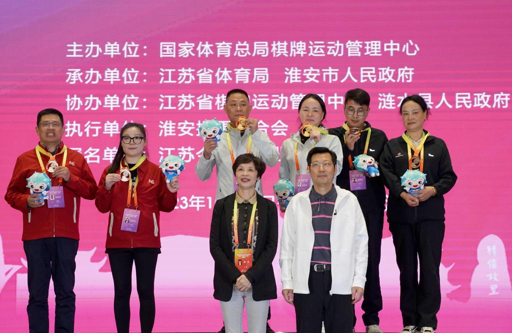 從18日預(yù)賽中脫穎而出的各組別前十名組合19日進(jìn)行了9輪豪威爾制比賽,最終江蘇隊(duì)獨(dú)得兩金,周笑宇/雍建軍獲得男子雙人組冠軍,王學(xué)琴/葛珍梅獲得女子雙人組冠軍;安徽隊(duì)的蔣莉/張榮理獲得混合雙人組冠軍。