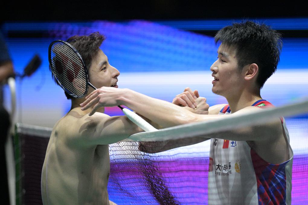 6月2日,石宇奇(左)與李詩(shī)灃在比賽后互相致意。新華社發(fā)(鄧智煒攝)