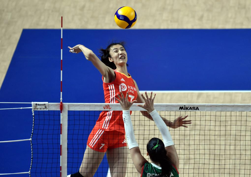 6月11日,中國隊球員朱婷(中上)在比賽中進(jìn)攻。新華社記者 朱煒 攝
