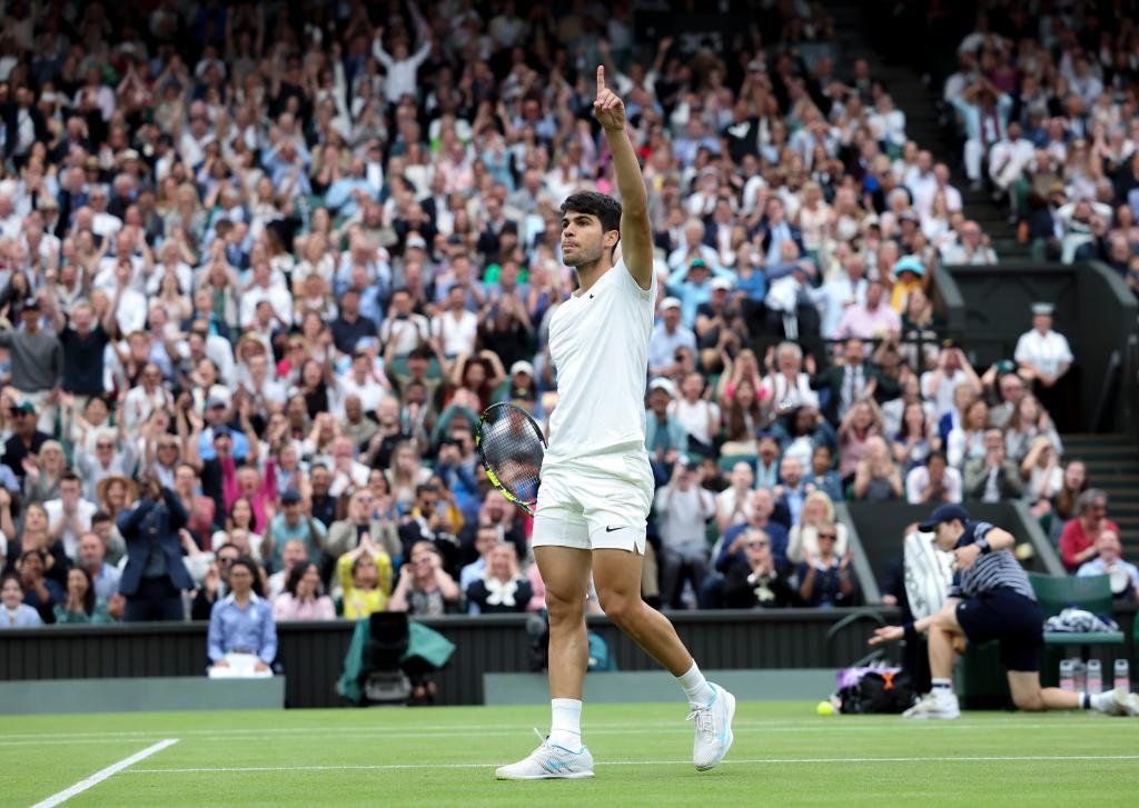 7月7日,阿爾卡拉斯在比賽中慶祝得分。新華社記者 韓巖 攝