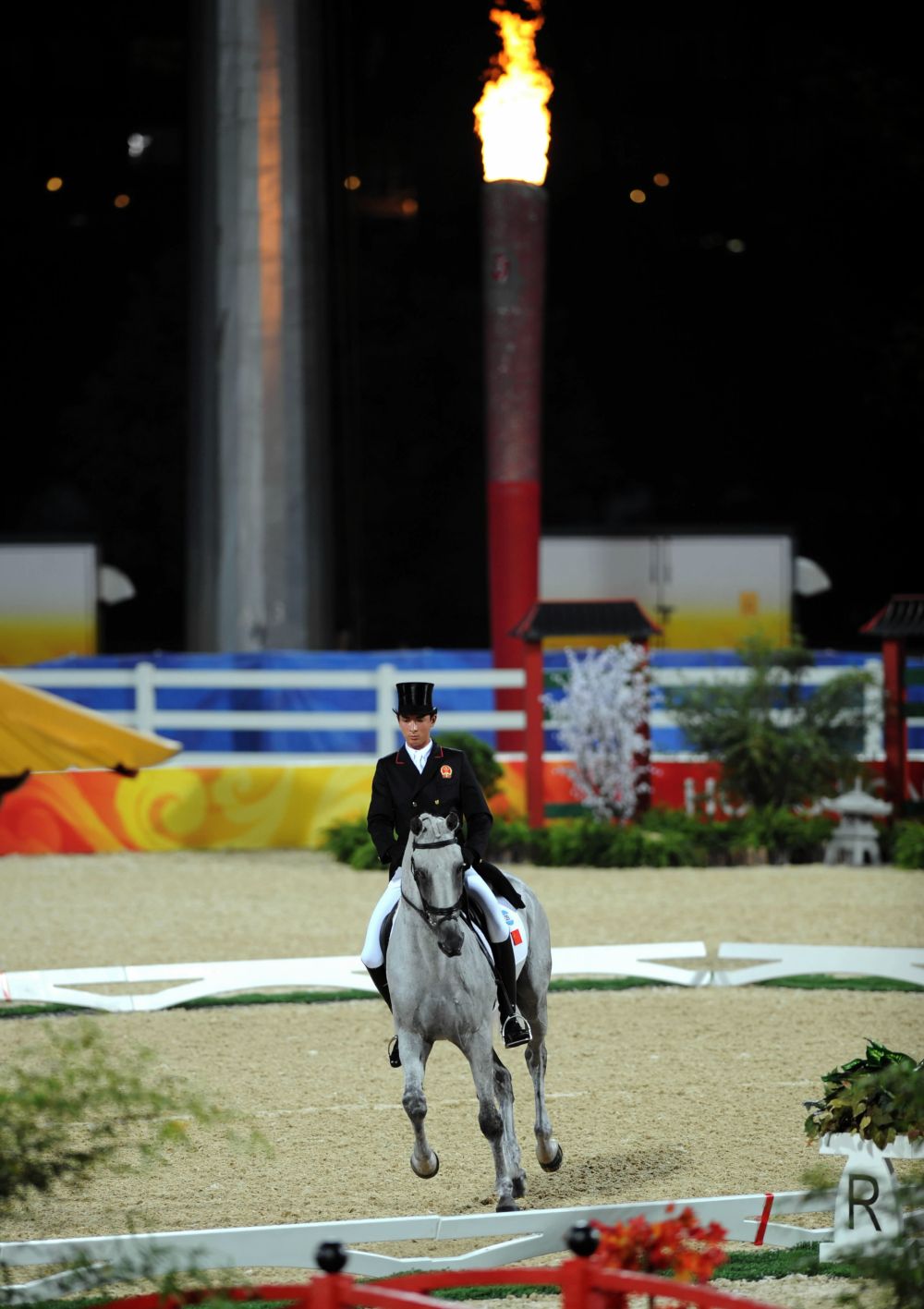 2008年8月9日,中國(guó)騎手華天在比賽中。當(dāng)日,中國(guó)騎手華天在香港參加北京奧運(yùn)會(huì)馬術(shù)比賽三項(xiàng)賽盛裝舞步賽,這是中國(guó)運(yùn)動(dòng)員首次亮相奧運(yùn)馬術(shù)比賽場(chǎng)。新華社記者 盧炳輝 攝
