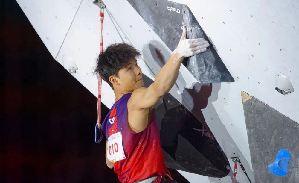 當(dāng)天,潘愚非右臂打著繃帶上場(chǎng),整條線路用他自己的話說“爬得比較掙扎”。他在9月的全國(guó)錦標(biāo)賽中右小臂拉傷,亞錦賽攀石項(xiàng)目結(jié)束后又有復(fù)發(fā)跡象。14日的決賽中,他爬到最后階段在高墻上一邊發(fā)力一邊吶喊。