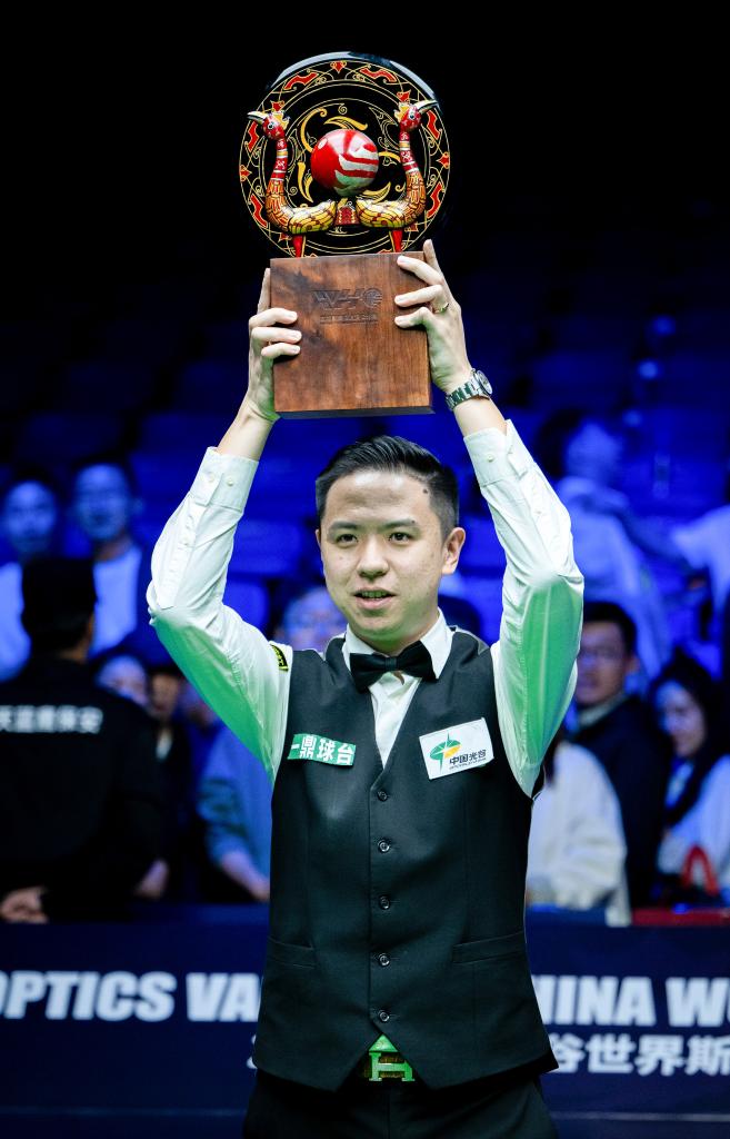 10月12日,肖國棟在2024世界斯諾克武漢公開賽頒獎儀式上舉起獎杯。新華社記者 胡競文 攝