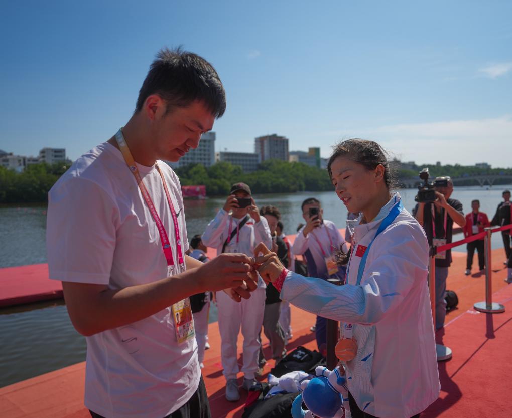 新華社三亞11月28日電(記者曹奕博、周慧敏)在海南省三亞市舉行的第十二屆全國(guó)少數(shù)民族傳統(tǒng)體育運(yùn)動(dòng)會(huì)(以下簡(jiǎn)稱(chēng)“運(yùn)動(dòng)會(huì)”)28日繼續(xù)進(jìn)行,雖然盛會(huì)臨近尾聲,但三亞河上泛起的愛(ài)情漣漪、蹴球場(chǎng)上堅(jiān)定的友誼并行和各族運(yùn)動(dòng)員圍攏在一起的親情之舞,交織成賽場(chǎng)內(nèi)外團(tuán)結(jié)和友誼的動(dòng)人故事。 在28日的獨(dú)竹漂女子組200米直道賽中,海南代表團(tuán)選手何國(guó)潤(rùn)在“一葦渡江”的驚險(xiǎn)后又經(jīng)歷了驚喜,獲得該項(xiàng)目三等獎(jiǎng)的她在頒獎(jiǎng)儀式后被男友浪漫求婚。在現(xiàn)場(chǎng)的參賽選手、媒體記者和觀眾的見(jiàn)證下,這對(duì)情侶相擁而吻,這一刻,波光粼粼的三亞河化身為愛(ài)河。