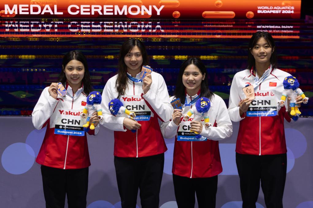 12月15日,季軍中國(guó)隊(duì)選手錢(qián)心安、唐錢(qián)婷、陳露穎、劉姝含(由左至右)在頒獎(jiǎng)儀式上。當(dāng)日,在短池世錦賽女子4x100米混合泳接力決賽中,中國(guó)隊(duì)獲得季軍。新華社發(fā)(弗爾季·奧蒂洛 攝)