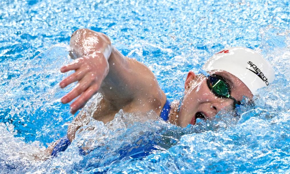 2月15日,龔真琦在2024年世界游泳錦標(biāo)賽女子4X200米自由泳接力決賽中。新華社記者 夏一方 攝
