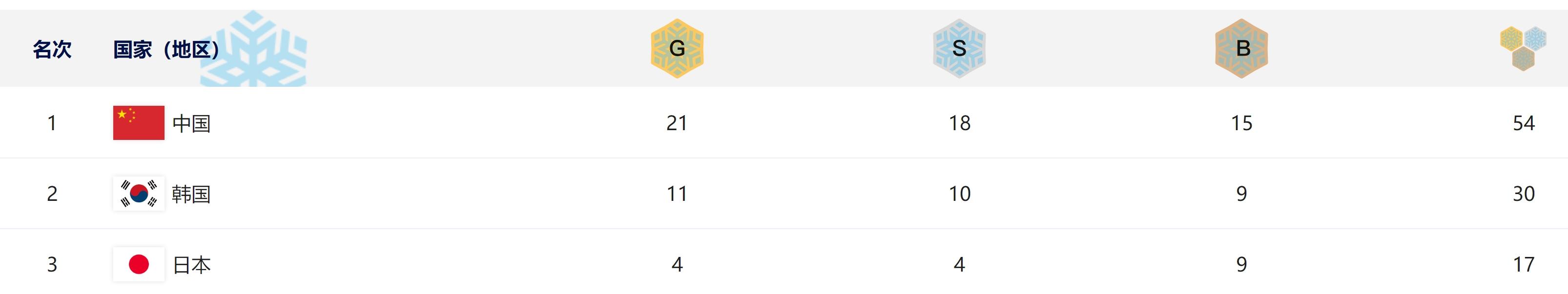 單日再奪6金,中國代表團(tuán)在本屆亞冬會(huì)已奪得21金18銀15銅,21金也創(chuàng)造了中國代表團(tuán)參加單屆亞冬會(huì)歷史最佳成績(jī)(此前為2007年長春亞冬會(huì)的19金)。韓國隊(duì)目前以11金10銀9銅排名獎(jiǎng)牌榜第二,日本隊(duì)以4金4銀9銅排名第三。
