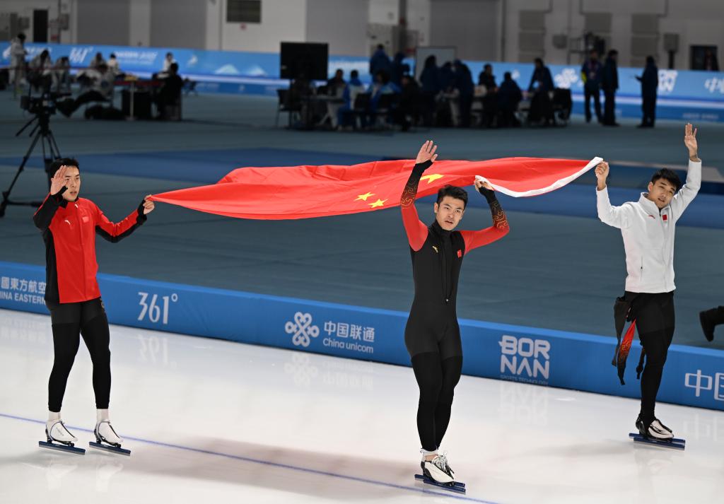 黑龍江省冰上訓(xùn)練中心速滑館里,《義勇軍進(jìn)行曲》三度奏響。當(dāng)日速度滑冰全部3枚金牌均被中國隊(duì)收入囊中。高亭宇先以0.02秒的微弱優(yōu)勢(shì)力壓日本選手森重航,奪得男子500米冠軍;又與隊(duì)友廉子文、寧忠?guī)r合作,奪得男子短距離團(tuán)體追逐金牌。女隊(duì)則又一次讓三面五星紅旗同時(shí)升起,楊濱瑜、韓梅、太智恩分獲女子3000米前三名。本屆亞冬會(huì)有三金入賬的高亭宇坦言不知道這會(huì)不會(huì)是自己最后一屆亞冬會(huì),“(這次)我的關(guān)鍵詞是努力,相信大家一起努力,中國速度滑冰會(huì)越來越好”。