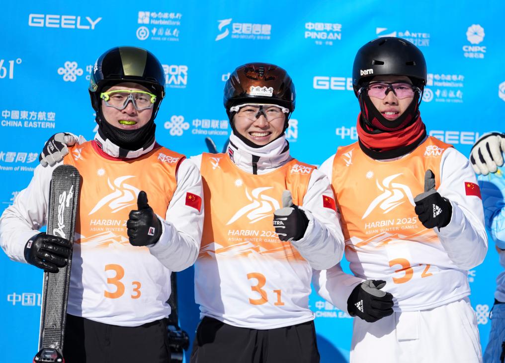 2月10日,齊廣璞、徐夢(mèng)桃和李心鵬(從左至右)在賽后合影。當(dāng)日,在亞布力舉行的第九屆亞冬會(huì)自由式滑雪空中技巧混合團(tuán)體決賽中,中國隊(duì)奪冠。新華社記者 賴向東 攝