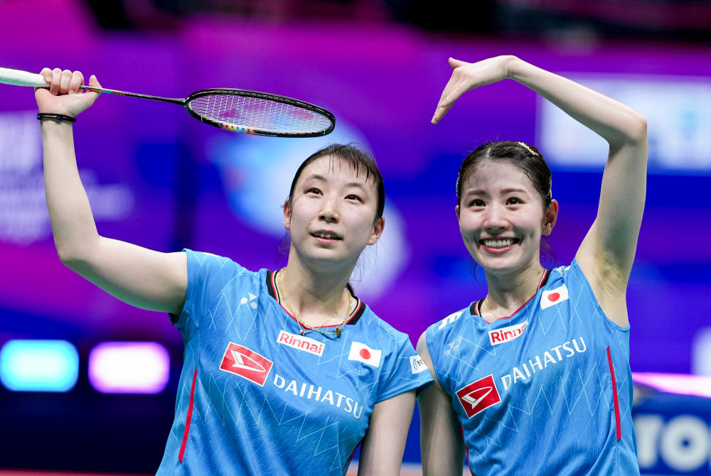 4月29日,日本隊組合五十嵐有紗/志田千陽(右)在女雙比賽后慶祝。最終,她們2:0戰(zhàn)勝法國隊組合朗貝爾/波格南特。新華社記者 孫非 攝