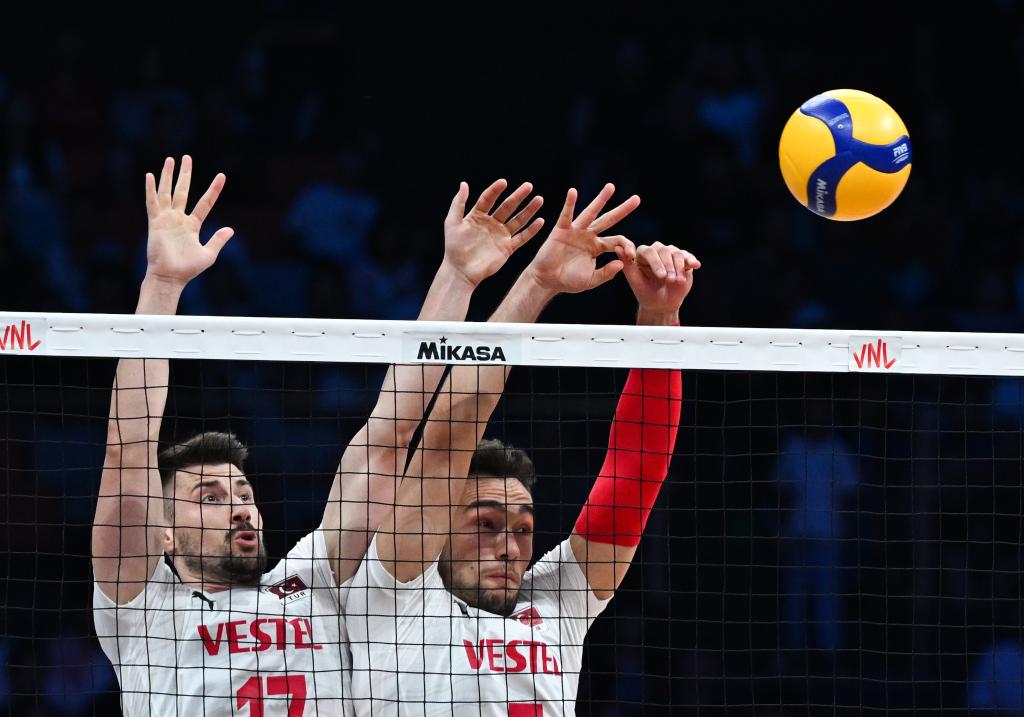 土耳其隊球員穆拉特·葉尼帕扎爾(左)、貝迪爾汗·比比爾在比賽中攔網(wǎng)。新華社記者 張博文 攝