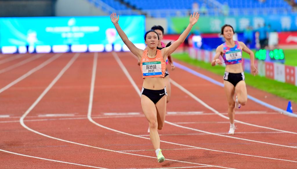 浙江隊(duì)選手陳妤頡(前)在第一屆全國青少年田徑運(yùn)動(dòng)會(huì)女子100米決賽沖線后慶祝。新華社記者 吳青昊 攝