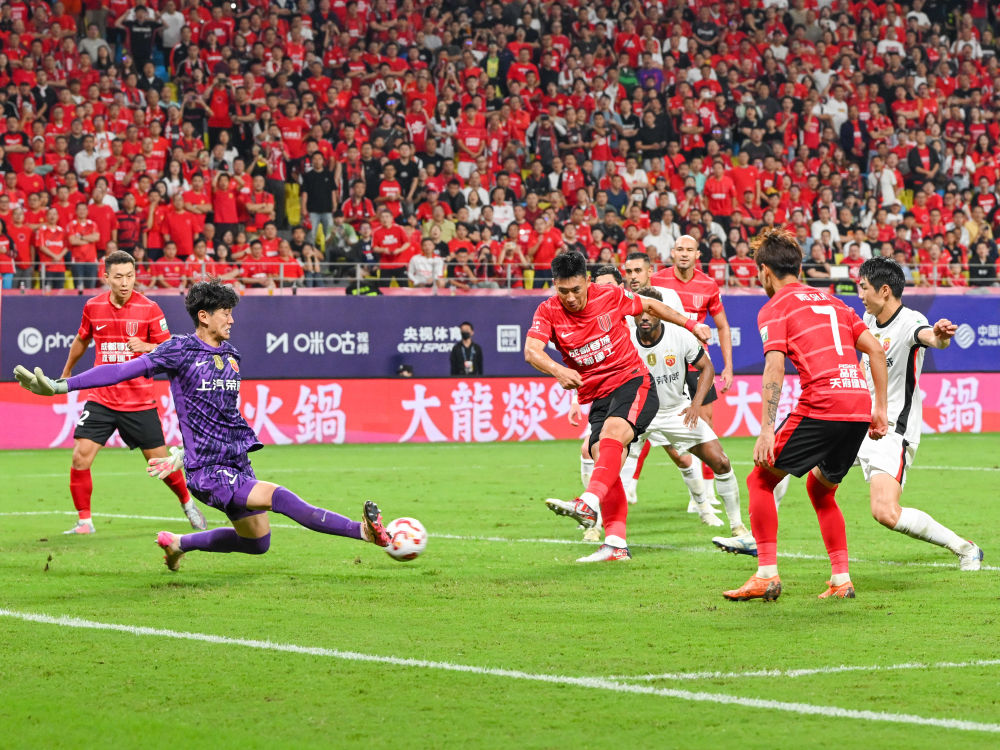 8月30日,成都蓉城隊(duì)球員楊帥(左三)在比賽中射門。當(dāng)日,在四川成都進(jìn)行的中國(guó)足球超級(jí)聯(lián)賽第23輪比賽中,成都蓉城隊(duì)主場(chǎng)4:1戰(zhàn)勝上海海港隊(duì)。新華社記者 王曦 攝
