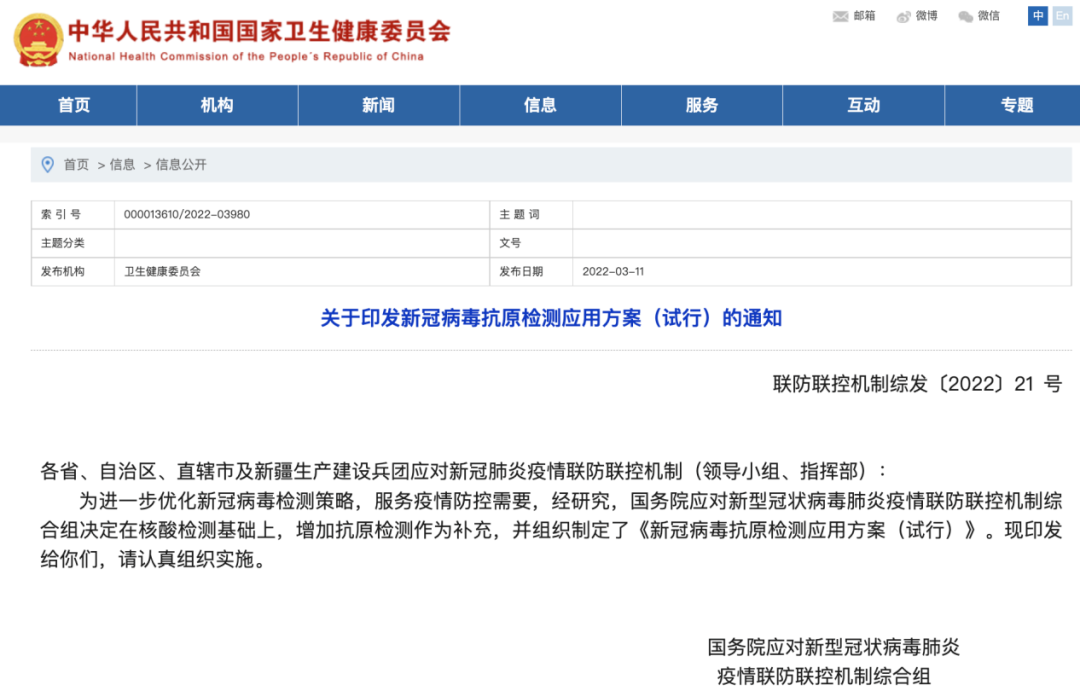 通知指出,為進一步優(yōu)化新冠病毒檢測策略,服務(wù)疫情防控需要,經(jīng)研究,國務(wù)院應對新型冠狀病毒肺炎疫情聯(lián)防聯(lián)控機制綜合組決定在核酸檢測基礎(chǔ)上,增加抗原檢測作為補充。