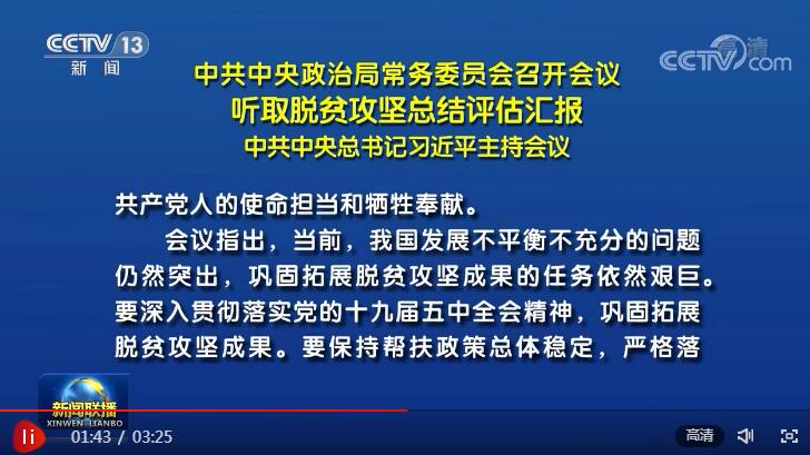 12月3日,中共中央政治局常務(wù)委員會(huì)召開會(huì)議,聽取脫貧攻堅(jiān)總結(jié)評(píng)估匯報(bào)。習(xí)近平總書記主持會(huì)議并發(fā)表重要講話。在講話中,總書記總結(jié)了黨的十八大以來脫貧攻堅(jiān)工作取得的成績(jī),肯定了各級(jí)黨委和政府以及社會(huì)協(xié)同發(fā)力、合力攻堅(jiān)的卓越付出。央視網(wǎng)《聯(lián)播+》特梳理講話及會(huì)議要點(diǎn),以饗讀者。