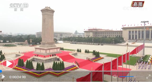 方陣前,以中共中央,全國人大常委會,國務院,全國政協,中央軍委,各民主黨派、全國工商聯和無黨派愛國人士,各人民團體和各界群眾,老戰(zhàn)士、老同志和烈士親屬,中國少年先鋒隊名義敬獻的9個大型花籃一字排開,花籃紅色緞帶上書寫的“人民英雄永垂不朽”熠熠生輝。