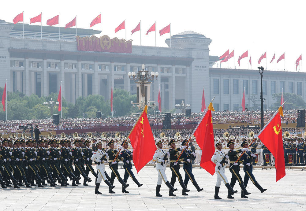 2025年9月3日,紀(jì)念中國人民抗日戰(zhàn)爭暨世界反法西斯戰(zhàn)爭勝利80周年大會在北京隆重舉行。這是戰(zhàn)旗方隊(duì)接受檢閱。新華社記者 王建華 攝