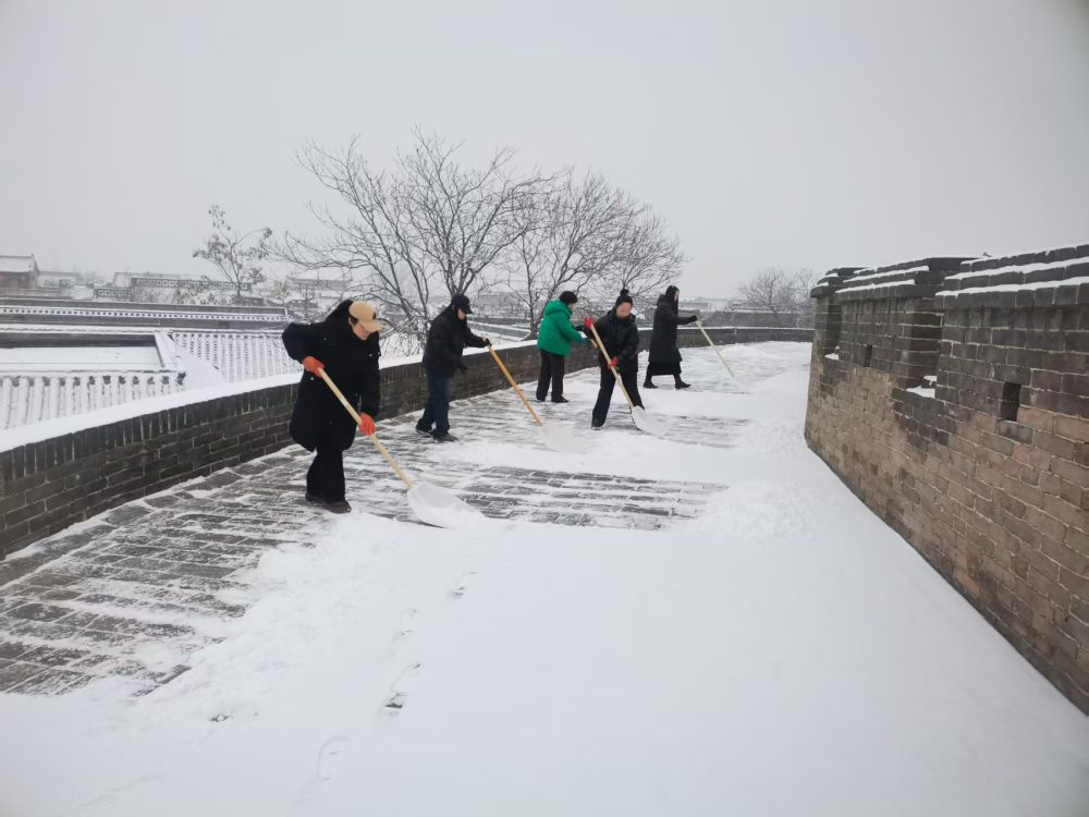 清晨6點,平遙古城的城墻上已是一番忙碌景象。全程6公里多的環(huán)線上,工作人員手持掃帚、鏟子,正細心地清掃青磚上的積雪。