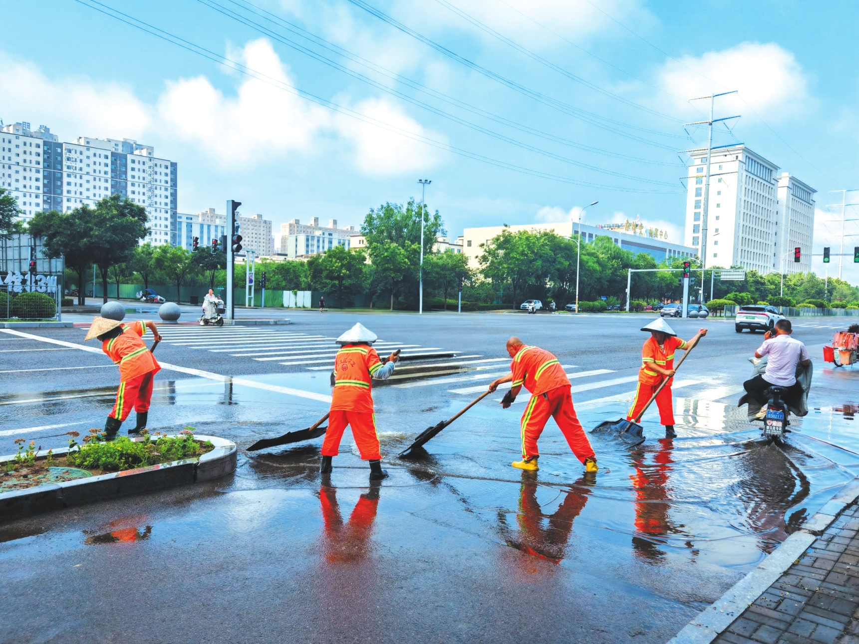 8月5日凌晨,我市降雨天氣造成城區(qū)部分道路路面積水。清晨,環(huán)衛(wèi)工人積極應對雨情,對轄區(qū)內(nèi)路段開展排水清淤工作,保障市民日常出行。圖為環(huán)衛(wèi)工人在紫檀街路口清理積水。本報記者王陽攝