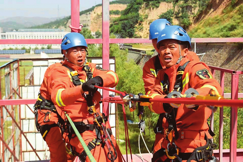 呂梁市消防救援支隊(duì)北川河西路特勤站消防員開(kāi)展繩索救援訓(xùn)練。張文兵攝