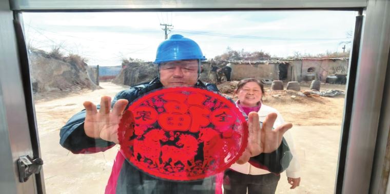 一個多小時后,皮卡車抵達(dá)紅糜梁村張偉小家。張偉小是村里的放羊漢,患有高血壓,定期給他捎降壓藥成了張吉?dú)g的順手工作。臨別前,張吉?dú)g仍不忘叮嚀他每天按時吃藥……皮卡車?yán)^續(xù)盤旋在溝壑之間,駛進(jìn)更偏遠(yuǎn)的的下養(yǎng)倉村。張劉女和老伴早已等候多時。張吉?dú)g卸下他們子女寄來的快遞,得知今年他們的二兒子一家因工作無法返鄉(xiāng)過年,他便默默搬來木梯,將一對紅燈籠穩(wěn)穩(wěn)地掛在院門上。燈籠亮起時,溫暖的光照在老人的臉龐上。