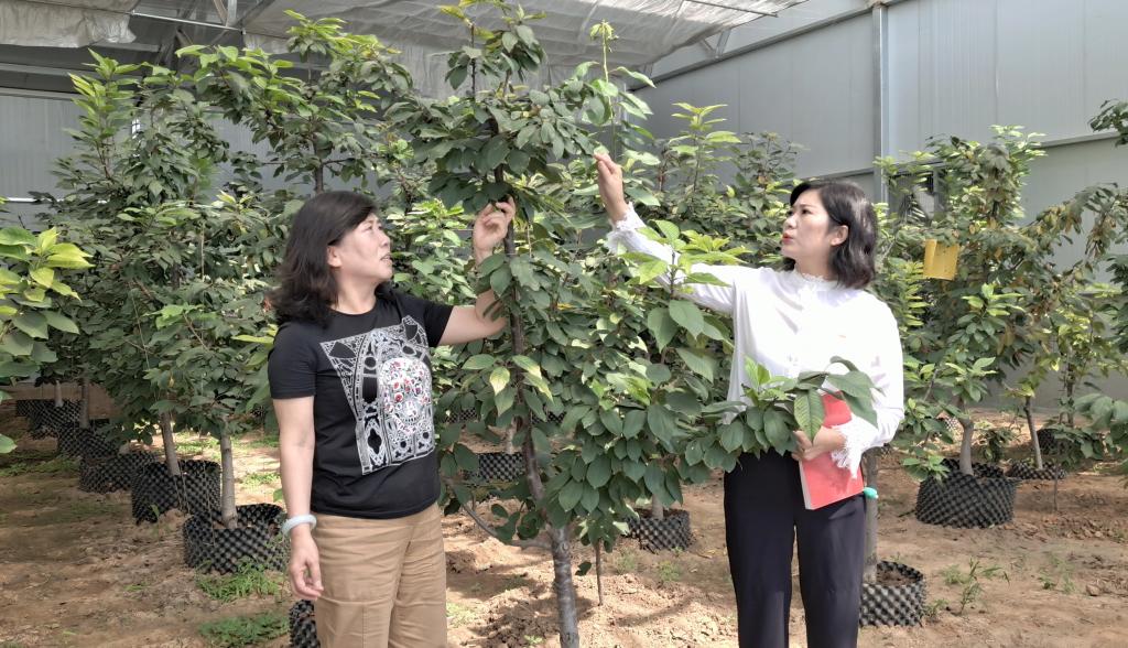 新路村黨支部書記、村委會主任劉翠萍與“櫻桃樹下”種植園有關(guān)負責人察看櫻桃長勢。張林泉 攝