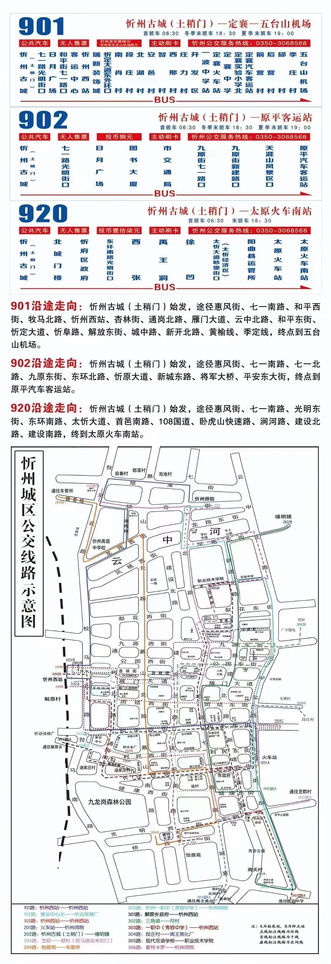 據(jù)悉,忻州古城至太原火車南站城際公交線路名稱為920路,運(yùn)行里程87公里,單程票價(jià)17元,投入20輛公交車,雙向?qū)Πl(fā)。首班發(fā)車時(shí)間6:30,末班發(fā)車時(shí)間18:30,發(fā)車間隔半小時(shí),沿途設(shè)11個(gè)站點(diǎn);忻州古城至原平汽車客運(yùn)站城際公交線路名稱902路,運(yùn)行里程55公里,單程票價(jià)8元,投入10輛公交車,雙向?qū)Πl(fā)。夏季首班發(fā)車時(shí)間6:30,末班發(fā)車時(shí)間19:00。冬季首班發(fā)車時(shí)間6:30,末班發(fā)車時(shí)間18:30,發(fā)車間隔半小時(shí),沿途設(shè)立9個(gè)站點(diǎn);忻州古城至定襄及五臺(tái)山機(jī)場城際公交線路名稱為901路,運(yùn)行里程62公里,單程票價(jià)6元,其中忻州到定襄縣城票價(jià)4元,投入10輛公交車,雙向?qū)Πl(fā)。夏季首班發(fā)車時(shí)間6:30,末班發(fā)車時(shí)間19:00。冬季首班發(fā)車時(shí)間6:30,末班發(fā)車時(shí)間18:30,發(fā)車間隔1小時(shí),沿途設(shè)立24個(gè)站點(diǎn)。