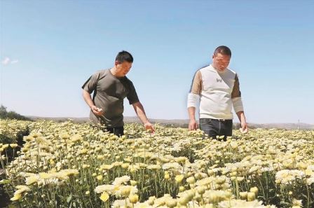 有了方向,行動(dòng)是關(guān)鍵。黨員徐大衛(wèi)主動(dòng)請(qǐng)纓,第一時(shí)間不遠(yuǎn)千里趕赴菊花主產(chǎn)區(qū)射陽(yáng)考察菊花種植項(xiàng)目,經(jīng)過(guò)充分分析研判,篩選適宜五寨種植的品種,最終選定北京菊試種。同時(shí),他帶著誠(chéng)意誠(chéng)心,從射陽(yáng)請(qǐng)來(lái)3名技術(shù)專(zhuān)家。在晉西北中藥材產(chǎn)業(yè)孵化園附近,他與3位專(zhuān)家同吃同住,深入田間地頭,與群眾同勞作、共生活。依據(jù)菊花種植要求,手把手教會(huì)群眾平整土地、開(kāi)挖溝槽、栽種澆水、鋤草施肥和采挖收儲(chǔ)等中藥材精耕細(xì)作技術(shù)。針對(duì)菊花農(nóng)殘、重金屬超標(biāo)的問(wèn)題,在試種過(guò)程中,他精心研究、反復(fù)摸索,大膽探索出了一套適用于菊花的種植技術(shù),實(shí)現(xiàn)了菊花農(nóng)殘可控的突破,先試種的100畝菊花,獲得了成功。