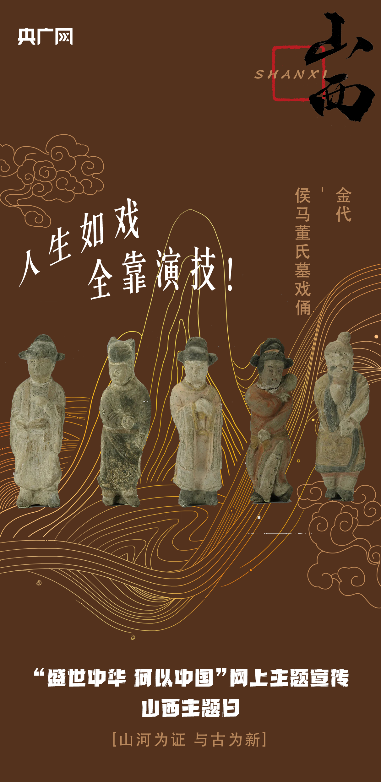 董氏墓戲俑。1959年出土于山西臨汾侯馬市西郊牛莊村的金代董明磚雕墓,一組5件,高約20厘米,5個(gè)戲俑并列一排。