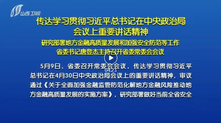 山西日?qǐng)?bào)報(bào)道 5月9日,省委召開(kāi)常委會(huì)會(huì)議,傳達(dá)學(xué)習(xí)貫徹習(xí)近平總書(shū)記在4月30日中央政治局會(huì)議上的重要講話(huà)精神,審議通過(guò)《關(guān)于全面加強(qiáng)金融監(jiān)管防范化解地方金融風(fēng)險(xiǎn)推動(dòng)地方金融高質(zhì)量發(fā)展的實(shí)施方案》,研究部署做好當(dāng)前全省安全防范工作。省委書(shū)記唐登杰主持會(huì)議。