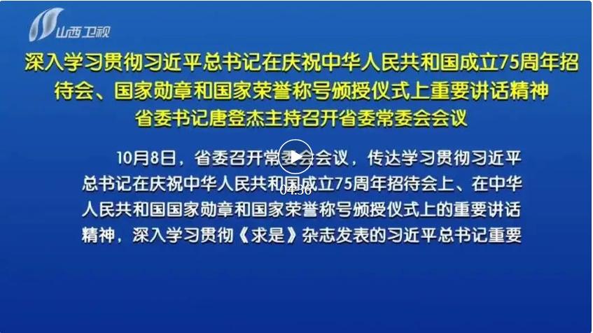 山西日?qǐng)?bào)報(bào)道 10月8日,省委召開常委會(huì)會(huì)議,傳達(dá)學(xué)習(xí)貫徹習(xí)近平總書記在慶祝中華人民共和國(guó)成立75周年招待會(huì)上、在中華人民共和國(guó)國(guó)家勛章和國(guó)家榮譽(yù)稱號(hào)頒授儀式上的重要講話精神,深入學(xué)習(xí)貫徹《求是》雜志發(fā)表的習(xí)近平總書記重要文章《大力弘揚(yáng)偉大愛國(guó)主義精神,把強(qiáng)國(guó)建設(shè)、民族復(fù)興偉業(yè)不斷推向前進(jìn)》,聽取上次中央巡視整改工作“回頭看”情況匯報(bào)。省委書記唐登杰主持會(huì)議并講話。