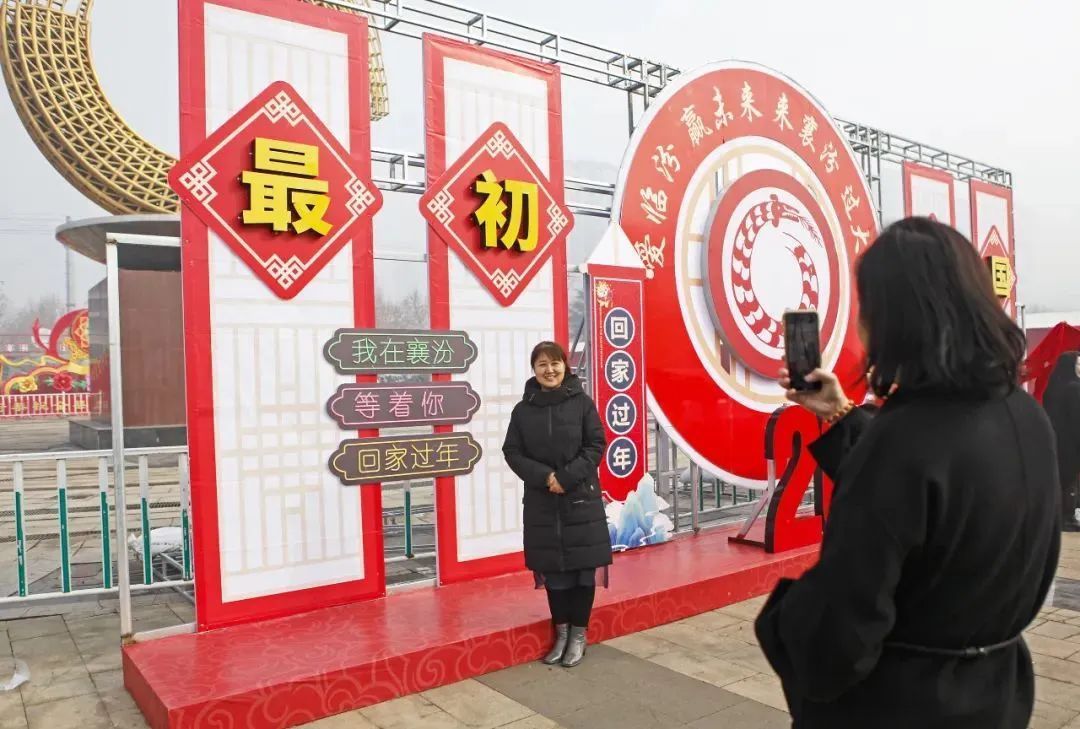 在臨汾,人們?cè)谙宸诙√瘴幕瘡V場(chǎng)內(nèi)陶寺龍盤(pán)展板前拍照,歡度新春佳節(jié);