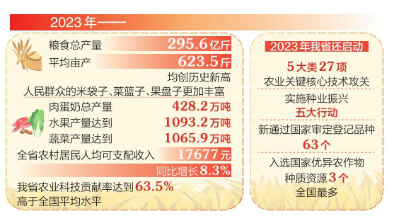 一分耕耘一分收獲。近年來,我省糧食和重要農(nóng)產(chǎn)品生產(chǎn)穩(wěn)定、供給充足,農(nóng)業(yè)農(nóng)村現(xiàn)代化不斷邁出新步伐。2023年,糧食總產(chǎn)量295.6億斤,平均畝產(chǎn)623.5斤,均創(chuàng)歷史新高;人民群眾的米袋子、菜籃子、果盤子更加豐富,肉蛋奶總產(chǎn)量428.2萬噸,水果、蔬菜產(chǎn)量分別達到1093.2萬噸、1065.9萬噸;全省農(nóng)村居民人均可支配收入17677元,同比增長8.3%。這些成績的取得,得益于科技賦能助力。2023年我省農(nóng)業(yè)科技貢獻率達到63.5%,高于全國平均水平。