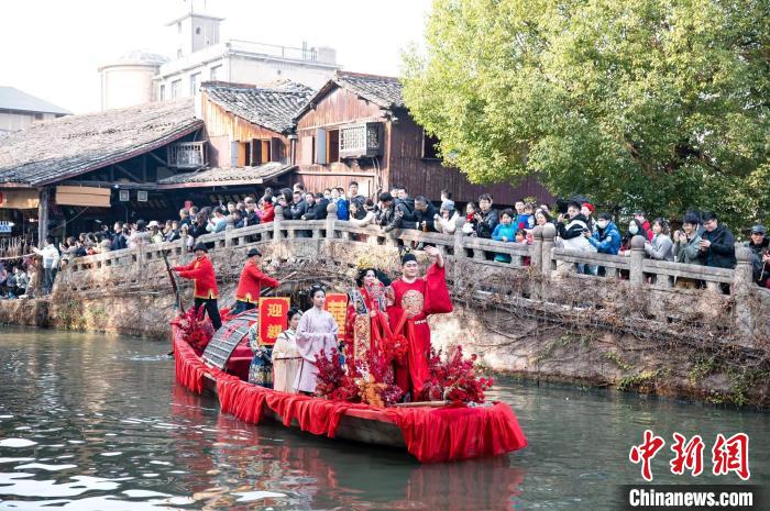 在浙江紹興安昌古鎮(zhèn),記者到訪時,在碧水之上,一場明制婚禮正在舉行,再現了烏篷船接親的當地婚俗。從單純表演到定制化服務,今年“五一”假期就有新人預訂了自己的水上婚禮。